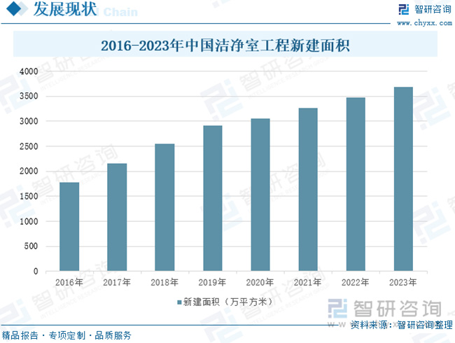 潔凈室工程是服務(wù)于高科技、國(guó)計(jì)民生的常青產(chǎn)業(yè),尖端科技的發(fā)展與居民日常生活質(zhì)量的提升無(wú)不有賴(lài)于潔凈技術(shù)發(fā)展作為其幕后的支持。近幾年來(lái),隨著空氣凈化核心領(lǐng)域技術(shù)實(shí)現(xiàn)根本性突破,國(guó)產(chǎn)凈化設(shè)備及系統(tǒng)集成快速成長(zhǎng),在產(chǎn)品質(zhì)量、制作成本、凈化性能等方面取得長(zhǎng)足進(jìn)步,潔凈室相關(guān)技術(shù)與服務(wù)也從醫(yī)學(xué)、航空航天等高端產(chǎn)業(yè)逐漸向全社會(huì)滲透,在食品生產(chǎn)和流通各環(huán)節(jié)、高端裝備制造、大型數(shù)據(jù)中心、化工產(chǎn)品生產(chǎn),甚至美容化妝等領(lǐng)域都取得了廣泛的應(yīng)用。目前,全球半導(dǎo)體、光電等電子信息產(chǎn)業(yè)在世界范圍內(nèi)轉(zhuǎn)移,東亞、東南亞等地區(qū)已成為世界電子信息行業(yè)的主要市場(chǎng)和發(fā)展重心;同時(shí)由于我國(guó)醫(yī)藥衛(wèi)生、半導(dǎo)體、航空航天等事業(yè)的不斷發(fā)展,加速推動(dòng)了潔凈室的市場(chǎng)化需求,從而帶動(dòng)我國(guó)潔凈室工程產(chǎn)業(yè)的快速發(fā)展。2023年,中國(guó)潔凈室工程新建面積達(dá)3689萬(wàn)平方米,同比增長(zhǎng)6.04%。